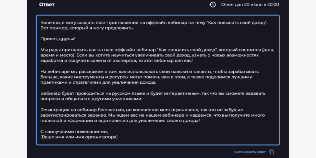 В итоге, если понять принцип взаимодействия с чат-ботом, можно получить неплохой информативный материал для наполнения сайтов, создания лендингов. Тут главное — не пытаться доверить всю работу ИИ, дополнять сгенерированный текс собственным мнением, живыми примерами.