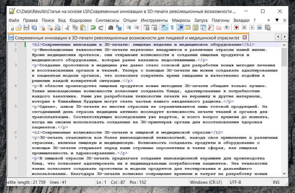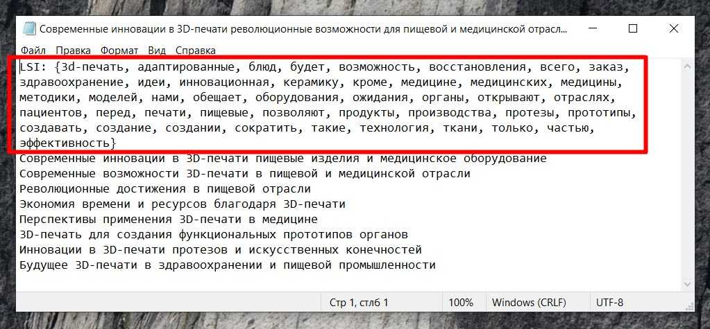 Напомним, что исходные данные, которые мы получили во время парсинга LSI из готовых статей представляют собой текстовый документ, пример которого Вы можете увидеть на скриншоте ниже: