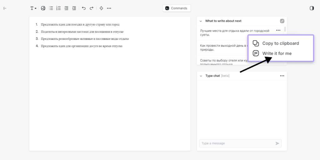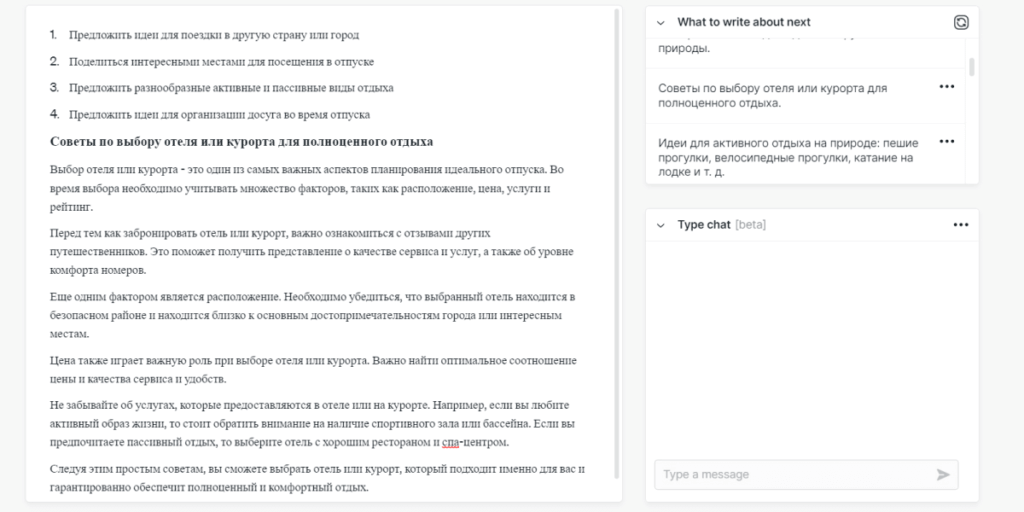 Результат у Type.AI вышел неплохой. Он привел 4 идеи и с помощью функции «Write it for me» дал развернутый ответ на им же предложенную идею.