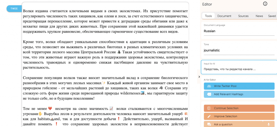 Интерфейс сервиса детально проработан, в нем приятно работать над подготовкой контента. Качество текста соответствует уровню современных моделям генерации текста, таким как GPT, Alpaca, Claude, LLama, но какая конкретно модель под капотом неизвестно. Сервис платный, а в демо-версии доступно 2000 кредитов, что примерно соответсвует 2000 сгенерированным словам.