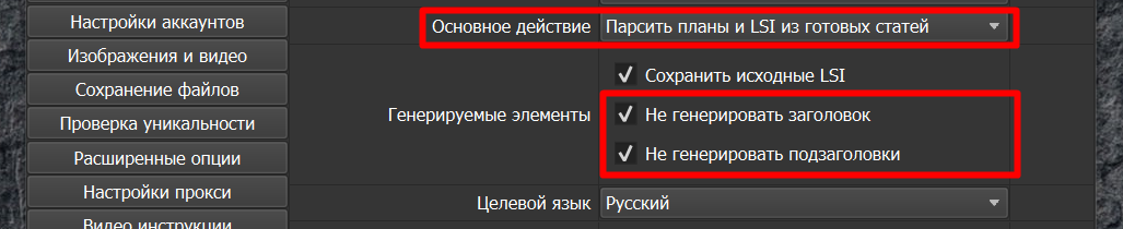 Если же заголовки нам не нужны, то в исходном файле с LSI просто удалите их или же на этапе, работы с функцией «Парсить планы и LSI из готовых статей» просто поставьте галочку «Не генерировать заголовки», «Не генерировать подзаголовки». Тогда в готовом файле будут содержаться только LSI фразы без заголовков.