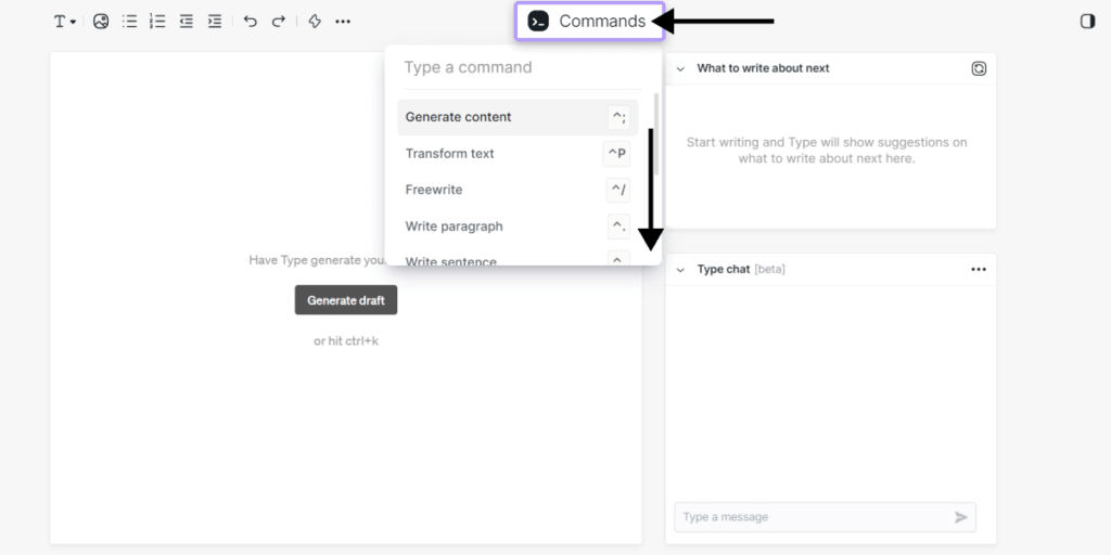А в окне «Type chat» вы можете задавать вопросы виртуальному ассистенту. Это ChatGPT внутри Type.AI.