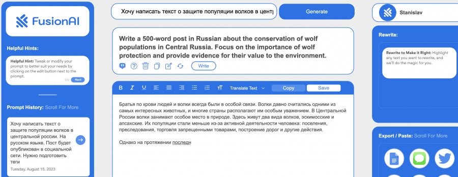 FusionAI — нейросеть, которая помогает генерировать задания для ChatGPT и других языковых моделей. Крайне полезный сервис для тех, кто никак не может получить желаемый результат при работе с нейросетями для генерации текста. От вас требуется поставить задачу «своими словами», а на выходе вы получите готовый промпт. Скопируйте промт и вставьте его в ChatGPT, и вы увидите, насколько лучше он стал вас понимать.
