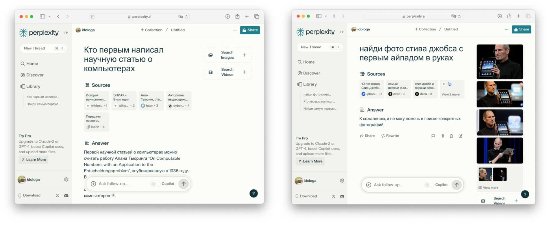 Perplexity — поисковый чат-бот, который отвечает на запрос выжимкой текста из релевантных источников. Кроме текста, ищет картинки и видео. Есть режим Copilot для суперточных запросов — например, чтобы подобрать рецепт или спланировать поездку, — и есть поддержка русского языка.