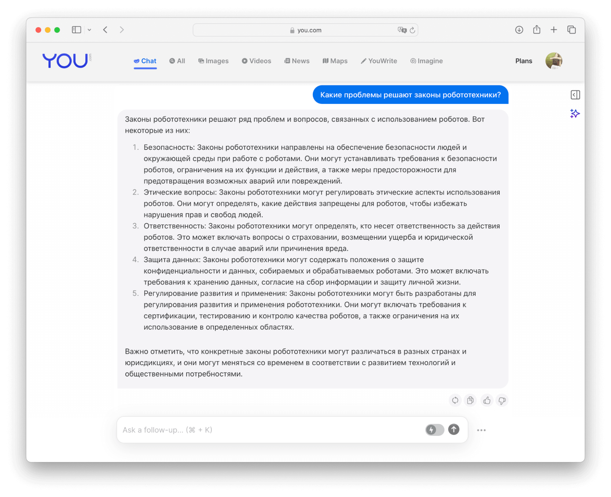 You — многофункциональный нейропоисковик, настоящий умный помощник. Чат-бот YouChat генерирует ответы на вопросы по найденной в интернете информации (ссылки на релевантные сайты можно посмотреть в соответствующей вкладке), ищет изображения, видеоролики, новости, есть даже поиск в картах. Работает на основе GPT-4, поддержка русского языка тоже есть.