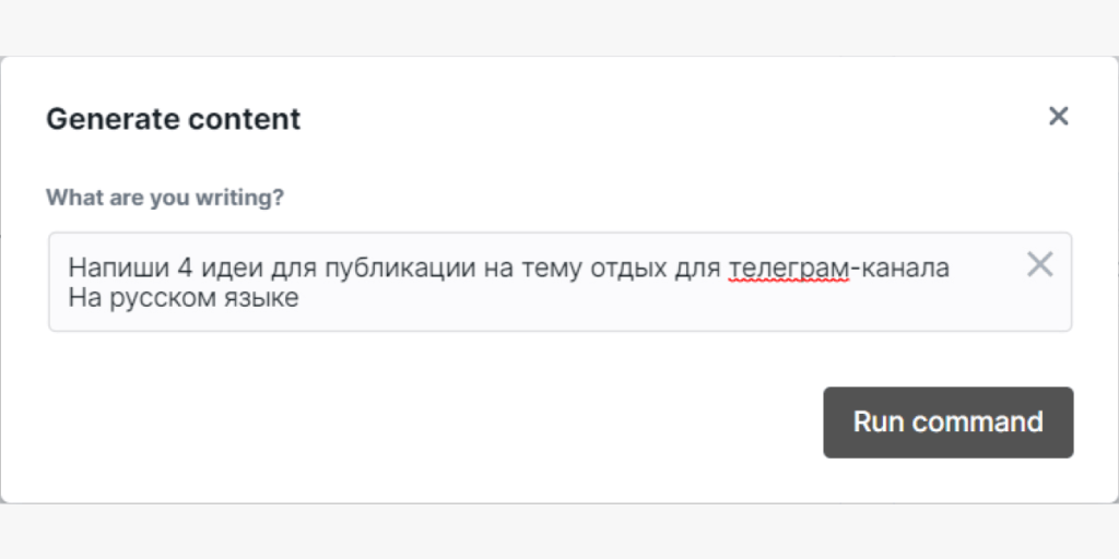 Например, команда «Generate content» позволяет создавать контент — для этого необходимо сформулировать задачу для искусственного интеллекта.