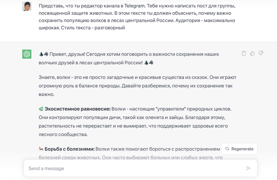 Задание может быть длиной от одной строчки до нескольких страниц, и чем подробнее вы опишете задачу, тем точнее будет итоговый результат. После получения первого варианта текста попросите ChatGPT внести исправления в конкретные части текста, указывая ему на ошибки и неточности для получения удовлетворительного результата. Пост для соцсетей можно создать, указав ограничения по длине и указав, для какой конкретно соцсети требуется стилизовать текст.