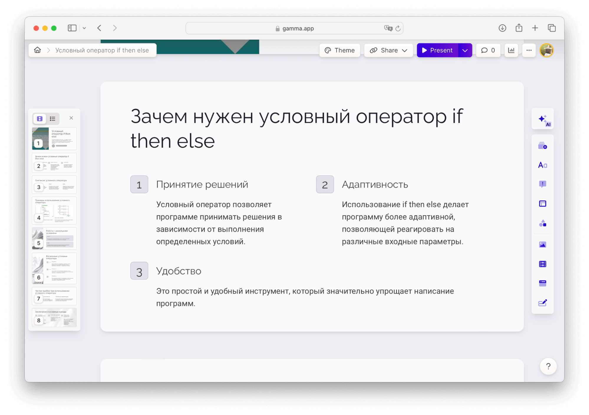 Первой на очереди будет, пожалуй, самая проработанная из всех нейросетей для создания презентаций – Gamma. Она позволяет задать тему для презентации на любом языке, после чего сформирует примерный план, который можно отредактировать, предложит выбрать стиль оформления, а также добавить тематические фотографии там, где это нужно. Помимо всего этого будет доступен и полноценный редактор, при помощи которого можно поправить некоторые слайды, заменить картинки или переписать текст.