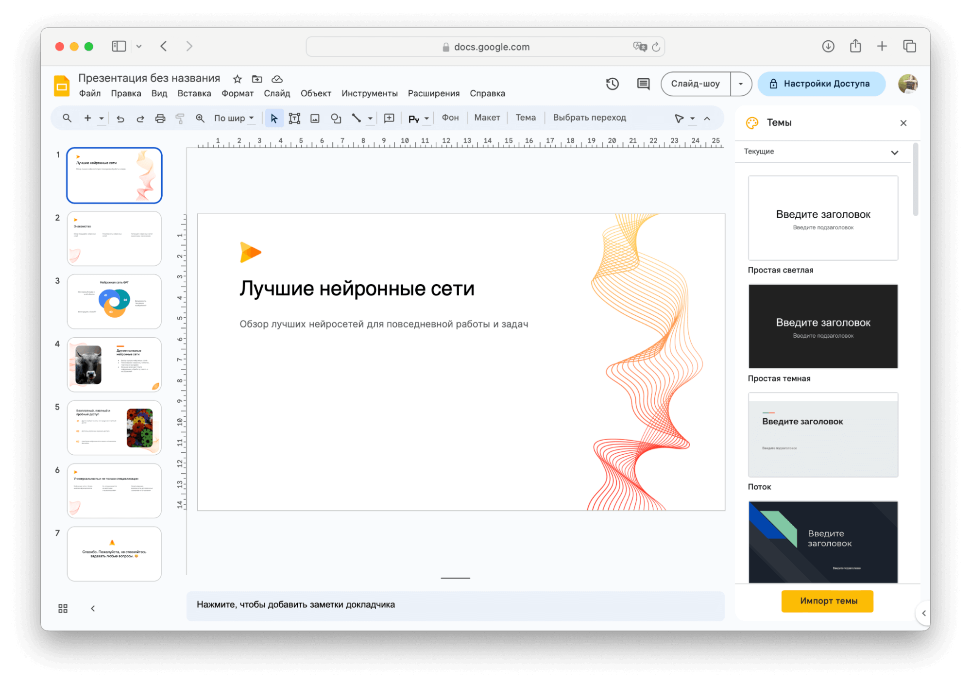 Slides AI — расширение для работы в Гугл-презентациях. Генерирует слайды на основе введённого текста (рекомендуется ввести не менее 350 знаков, чтобы нейронка поняла контекст, подобрала оптимальное количество и дизайн слайдов и создала их). Есть поддержка русского языка.