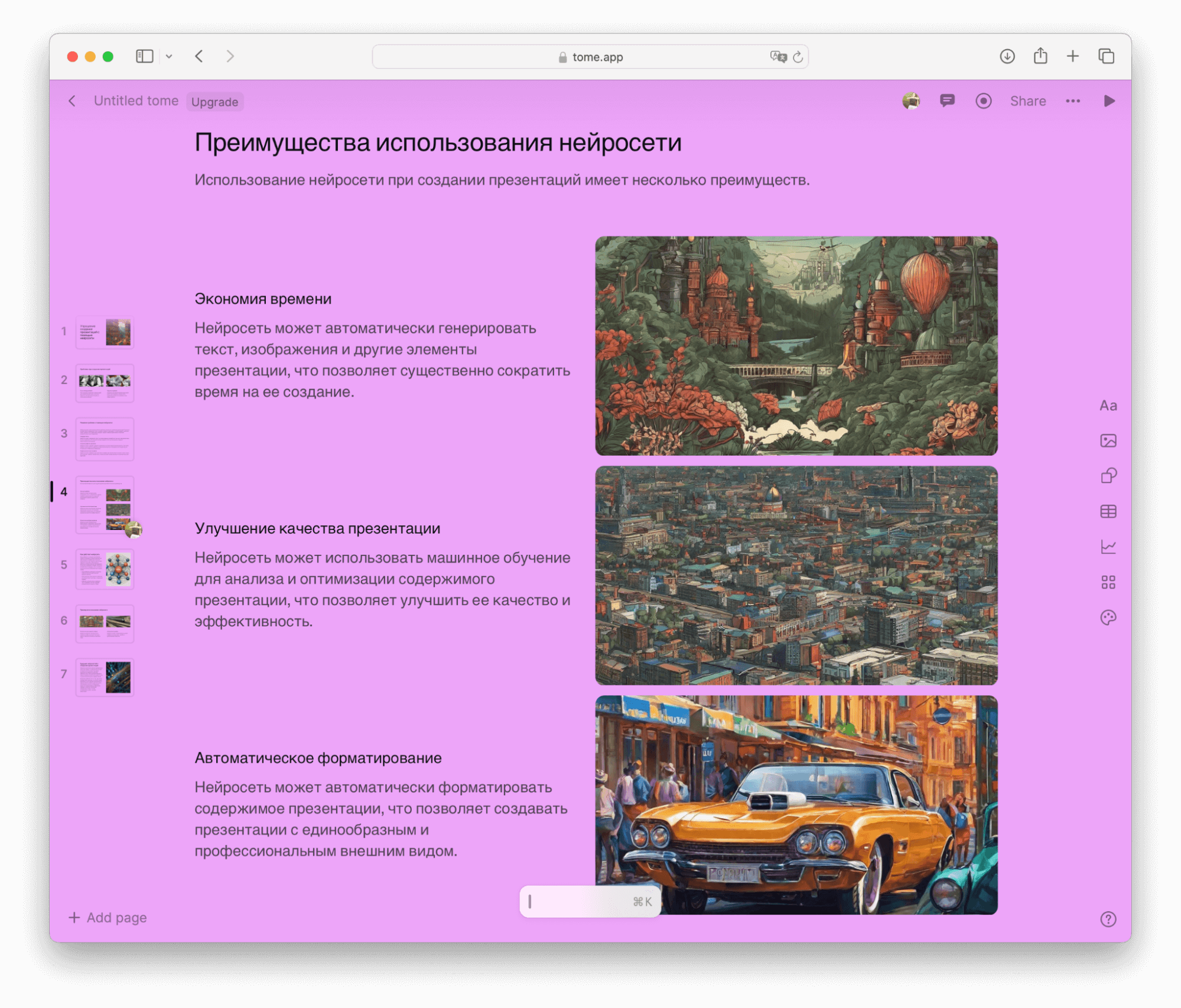 Последняя на сегодня нейросеть для создания презентацией, причём с интегрированным ChatGPT. На данный момент она находится в этапе бета-теста, поэтому разработчики активно прислушиваются к своим пользователем, добавляя множество обновлений по совершенствованию работы ИИ.