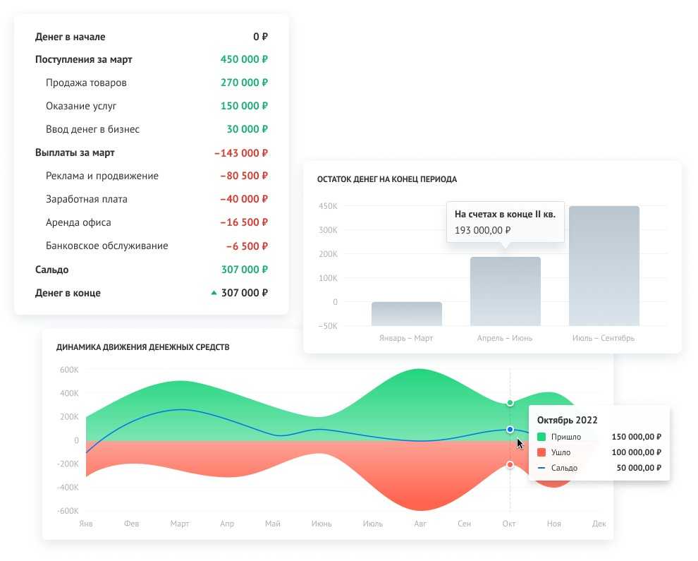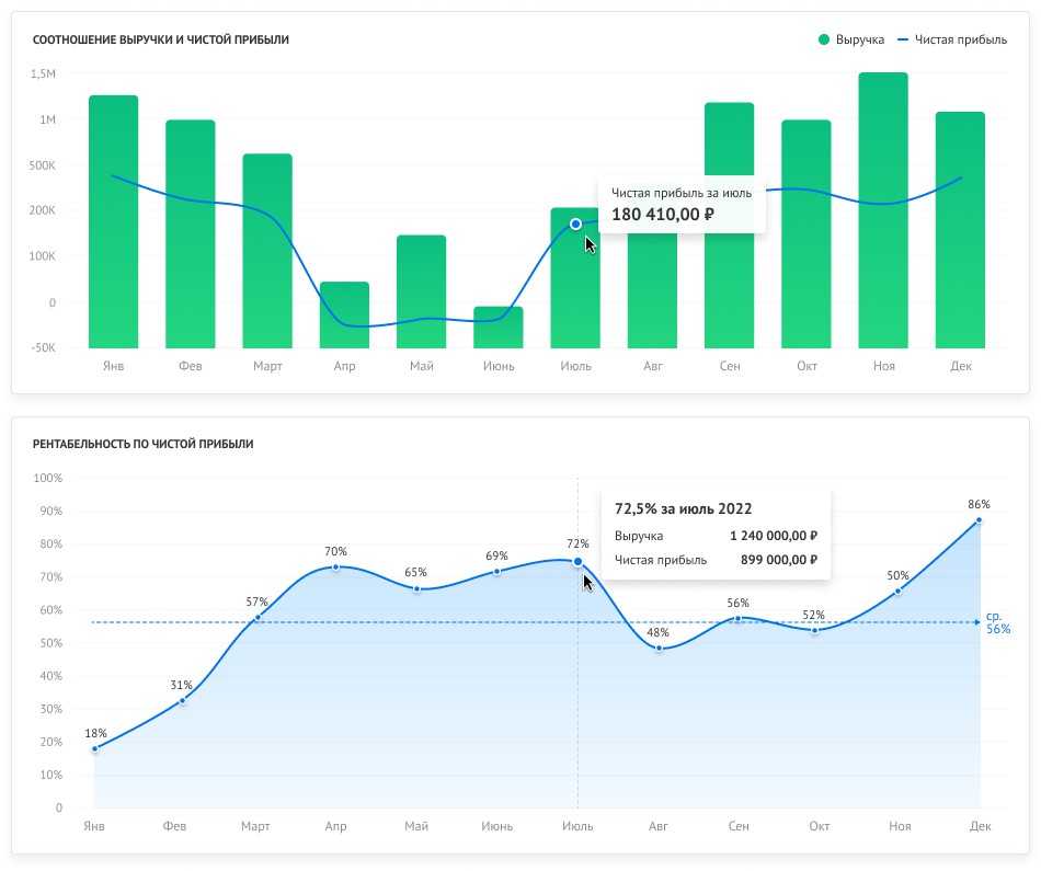 Для ежедневного мониторинга финансового состояния компании есть удобный дашборд — на нем можно увидеть не приближается ли кассовый разрыв, оценить самые прибыльные проекты, посмотреть рентабельность и много чего еще.