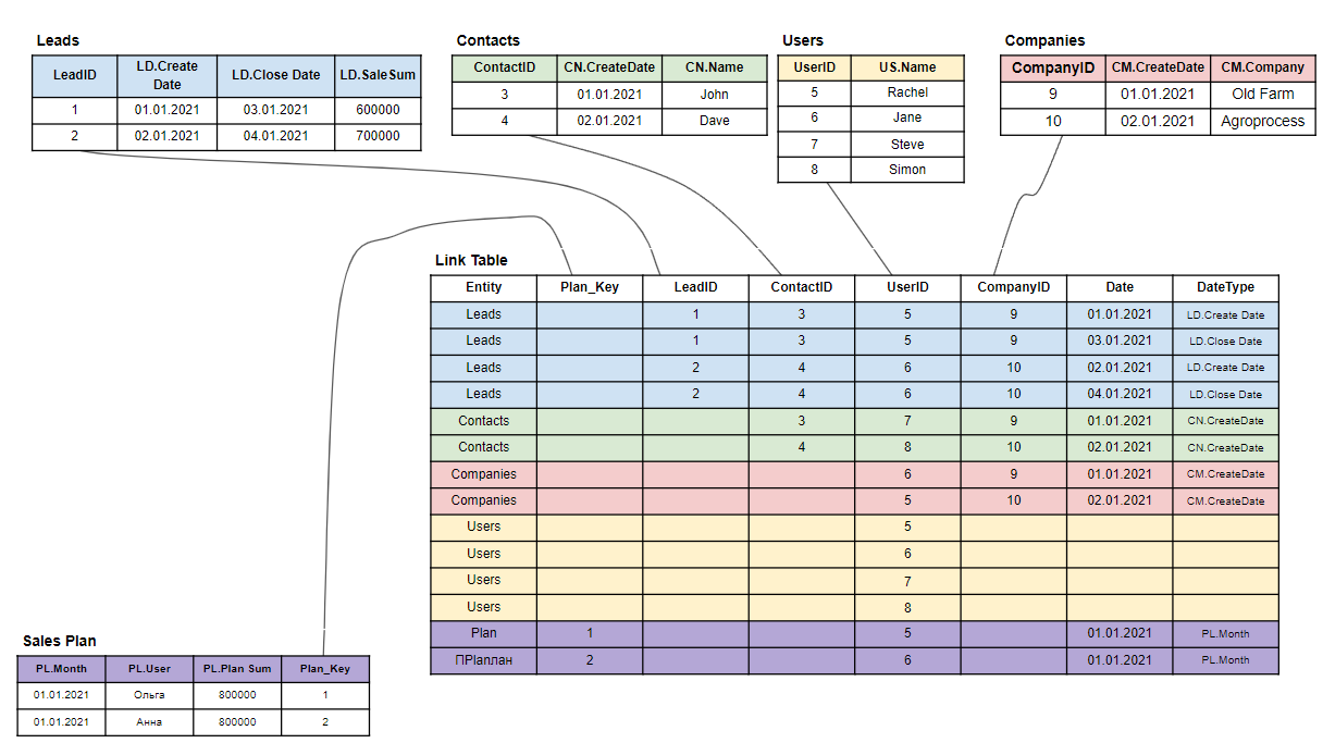 Наиболее подходящей для задач бизнес-аналитики и визуализации в BI является топология Звезда. В ней таблицы данных соединяются не между собой напрямую, а через центральную промежуточную таблицу. Есть разные вариации звезды, например когда в центральную часть выносятся не только поля для связи, но и поля расчетов мер. Но общий принцип построения не изменен, и это плюс — такая модель будет работать одинаково в разных визуализаторах. Это максимально развязывает вам руки в выборе платформы, и упрощает возможную миграцию между системами аналитики в будущем.