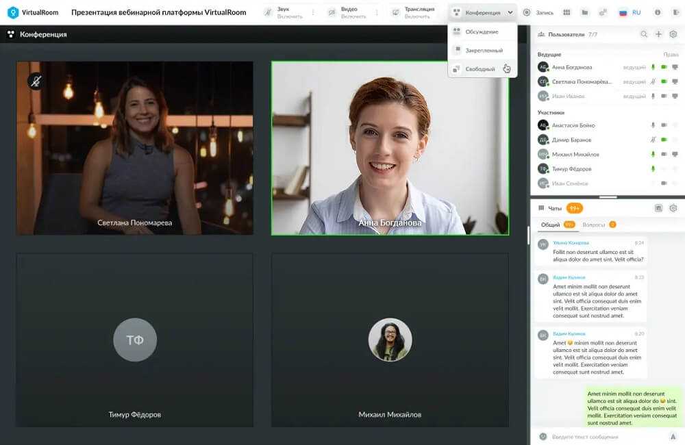 Интерфейс вебинарной комнаты Virtual Room