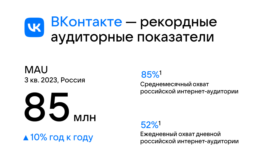 Средняя месячная аудитория (MAU) ВКонтакте в России к концу третьего квартала 2023 года достигла 85 млн пользователей. За год показатель вырос на 10%, сообщается в отчете площадки.