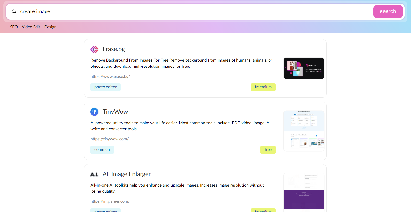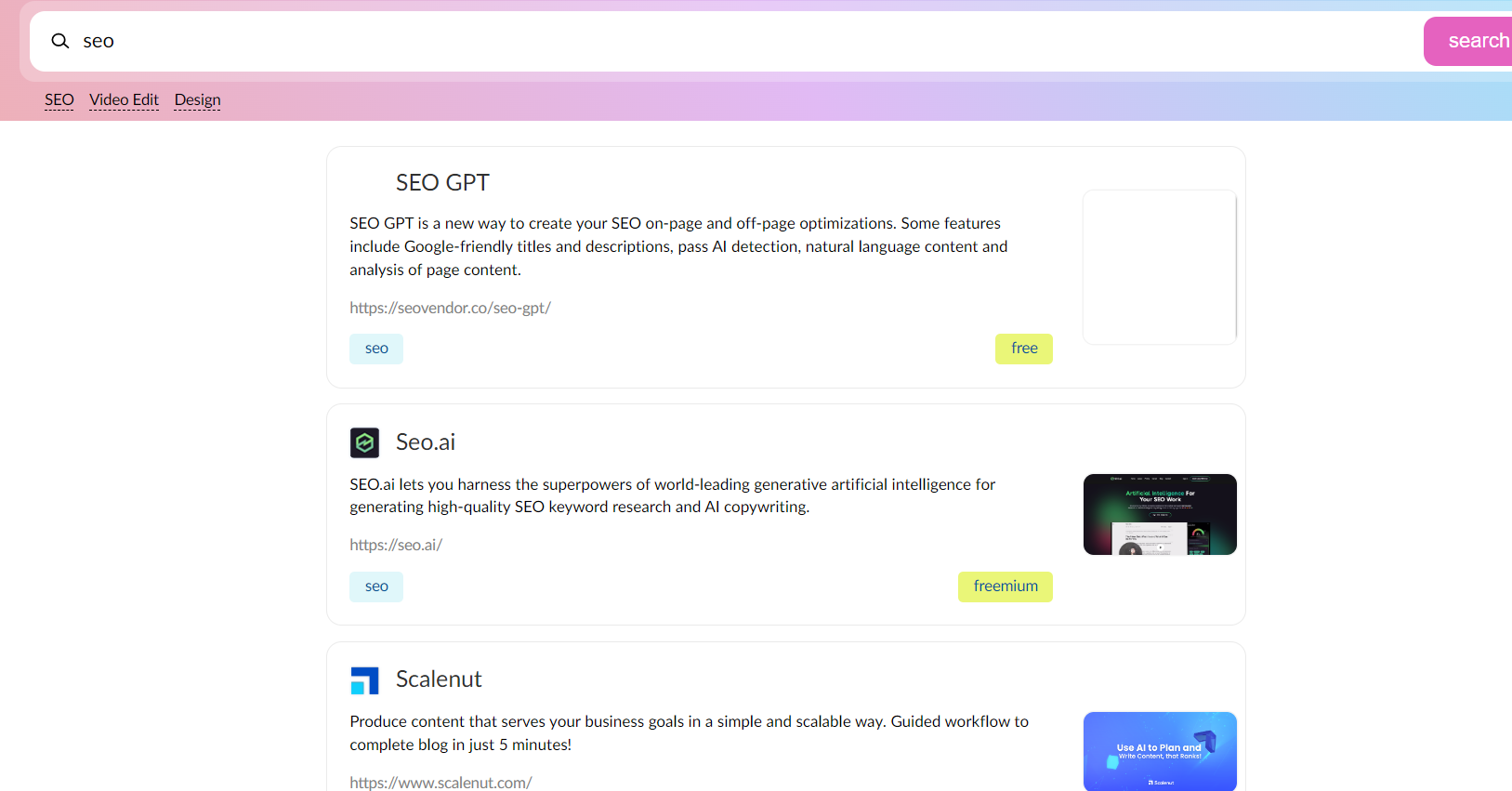 - Сервис выдаст вам список нейросетей по ключевым словам с коротким описанием и обозначением цены ИИ (платно, бесплатно и др.)