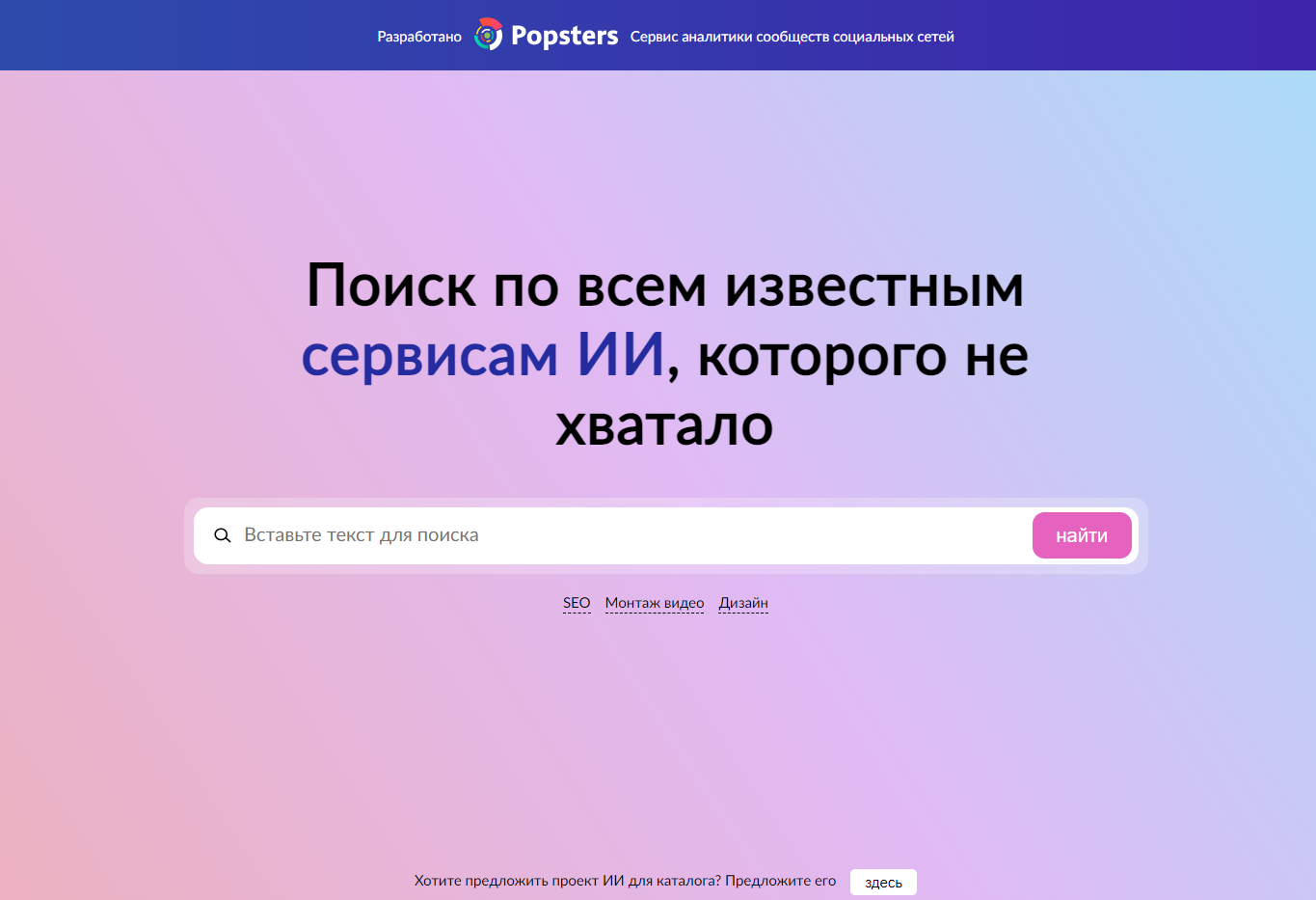 Поисковик работает на основе личной базы, в которую загружено большое количество существующих, популярных и полезных нейросетей. Поиск совершается по ключевым словам.