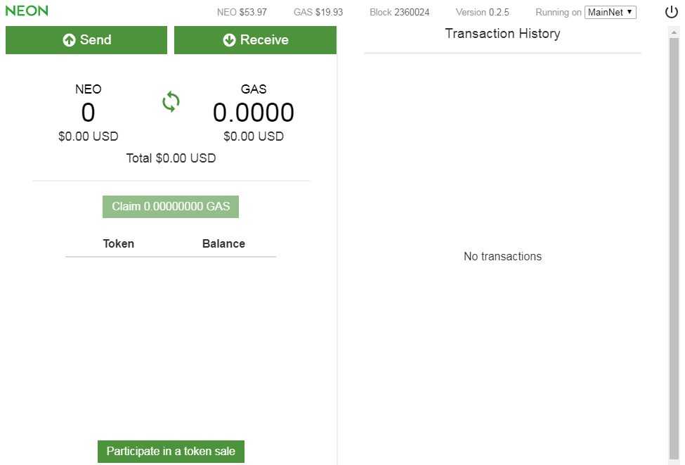 Тут необходимо выбрать название созданного и сохраненного кошелька Neon Wallet из всплывающего списка, ввести пароль и нажать кнопку «Login». После этого откроется интерфейс кошелька, где будут отображаться средства в NEO и GAS. С правой стороны будут доступны осуществленные транзакции, а с левой стороны, помимо баланса, кнопки «Send» — отправить, и «Receive» — получить средства.