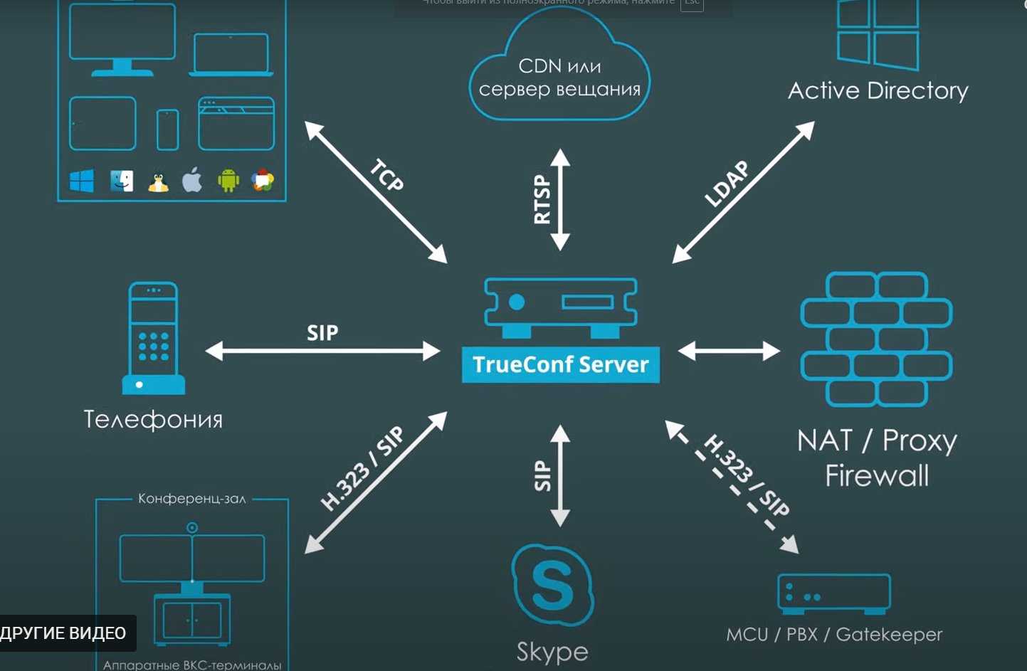 Программа TrueConf — российский аналог Zoom, набирающий популярность в РФ. Софт работает на базе программного сервера для взаимодействия внутри предприятия, не требует подключения к Интернету. ПО совместимо со Скайп, предусмотрена интеграция с системами CCTV, возможность применения в переговорных комнатах и т. д. Количество участников конференции — до 20.