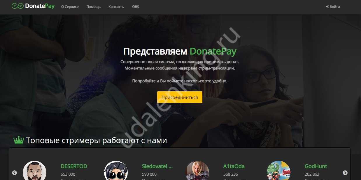 Платформа приема донатов на стриме, которая работает с аккаунтами OBS и XSplit. Здесь можно настраивать и добавлять виджеты с оповещениями, целями, топом донатеров. Страницу сбора можно настроить — добавить аватар, обложку, ссылки на соцсети. Дополнительно можно кастомизировать страницу благодарности.