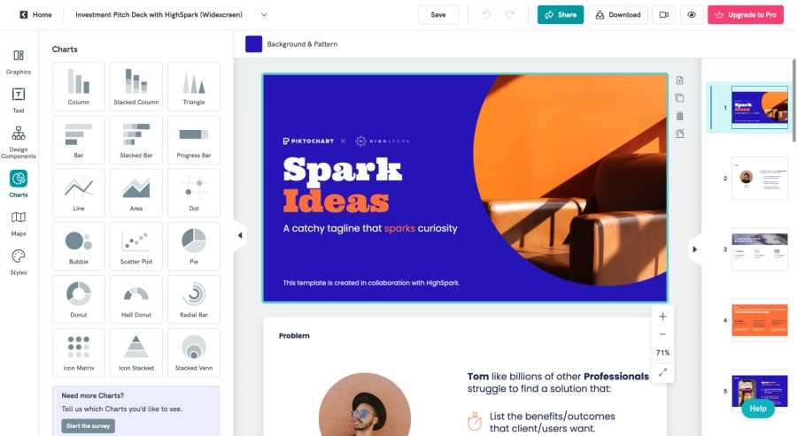 В Piktochart можно создавать презентации, инфографики, отчёты, флаеры и материалы для социальных сетей. Сервис часто используют, чтобы визуализировать статистические данные. Пользователям предлагают много функций из графических редакторов: слои, большой набор шрифтов, фоны, эффекты, таймлайны, вставка видео, таблиц, карт и диаграмм. Есть совместный доступ по ссылке — можно делиться с коллегами и вместе работать внутри файла.