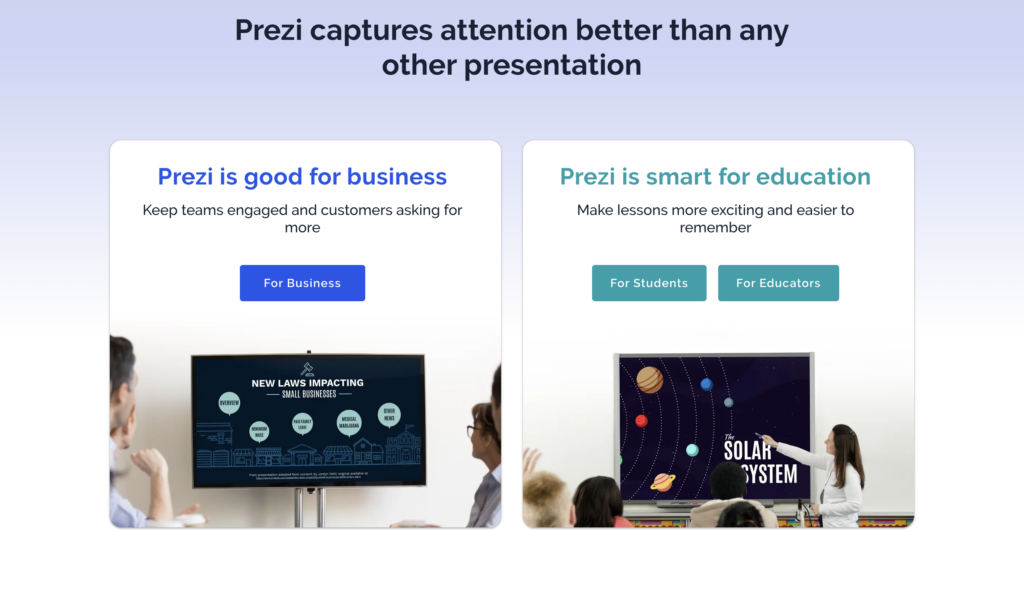 С помощью Prezi можно создавать, редактировать и публиковать презентации в онлайн-доступе. Эта платформа была основана в 2009 году в США — за 15 лет сервис стал один из самых популярных и часто используемых онлайн-платформ для создания бизнес-презентаций. В основе лежит масштабируемый пользовательский интерфейс — виртуальное пространство, которое можно редактировать при помощи различных инструментов. Бесконечный холст — так ещё называют этот интерфейс, и есть отличительная особенность приложения. Пользователи не ограничены слайдами, а могут работать на большом пространстве и перемещаться в разные области будущей презентации. Сразу стоит отметить — этот вариант не особо подходит для новичков. Чтобы работать с сервисом, нужна насмотренность и умение создавать нелинейные файлы. Как только вы вольётесь в процесс, то поймёте — у Prezi широкий функционал. Платформа богата возможностями для разработки персонального стиля — это и шрифты, и фоны, и различные градиенты — выберите то, что придётся по душе. При этом сервис предлагает множество шаблонов и файлов, на основе которых можно сделать свой проект для определённой аудитории, добавить подходящие детали.