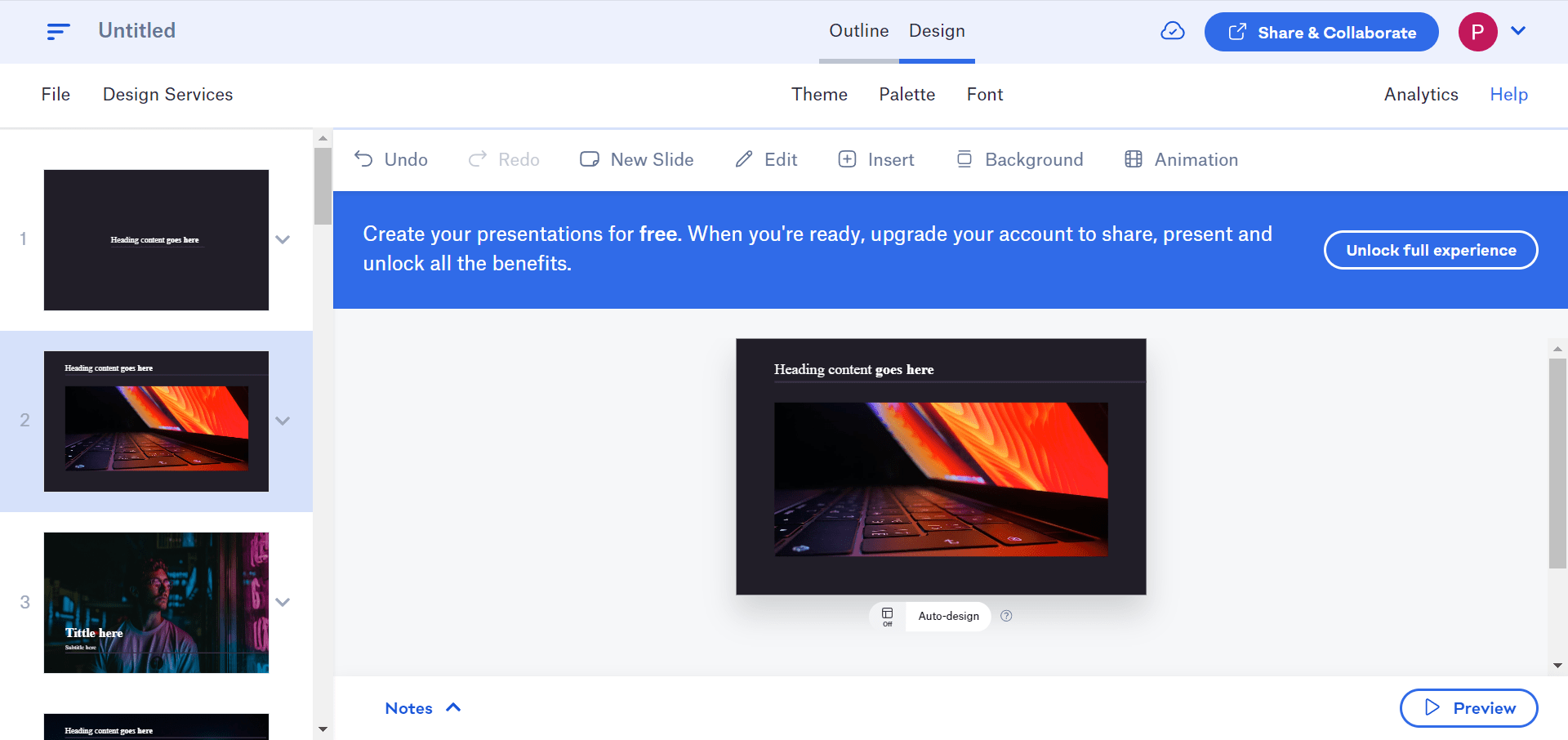 В нём можно создавать разные типы визуала, в том числе инфографику, а не только презентации. Вполне подойдёт для создания презентации на скорую руку, потому что простота сочетается с актуальным дизайном элементов и достаточным количеством инструментов для работы со слайдами.