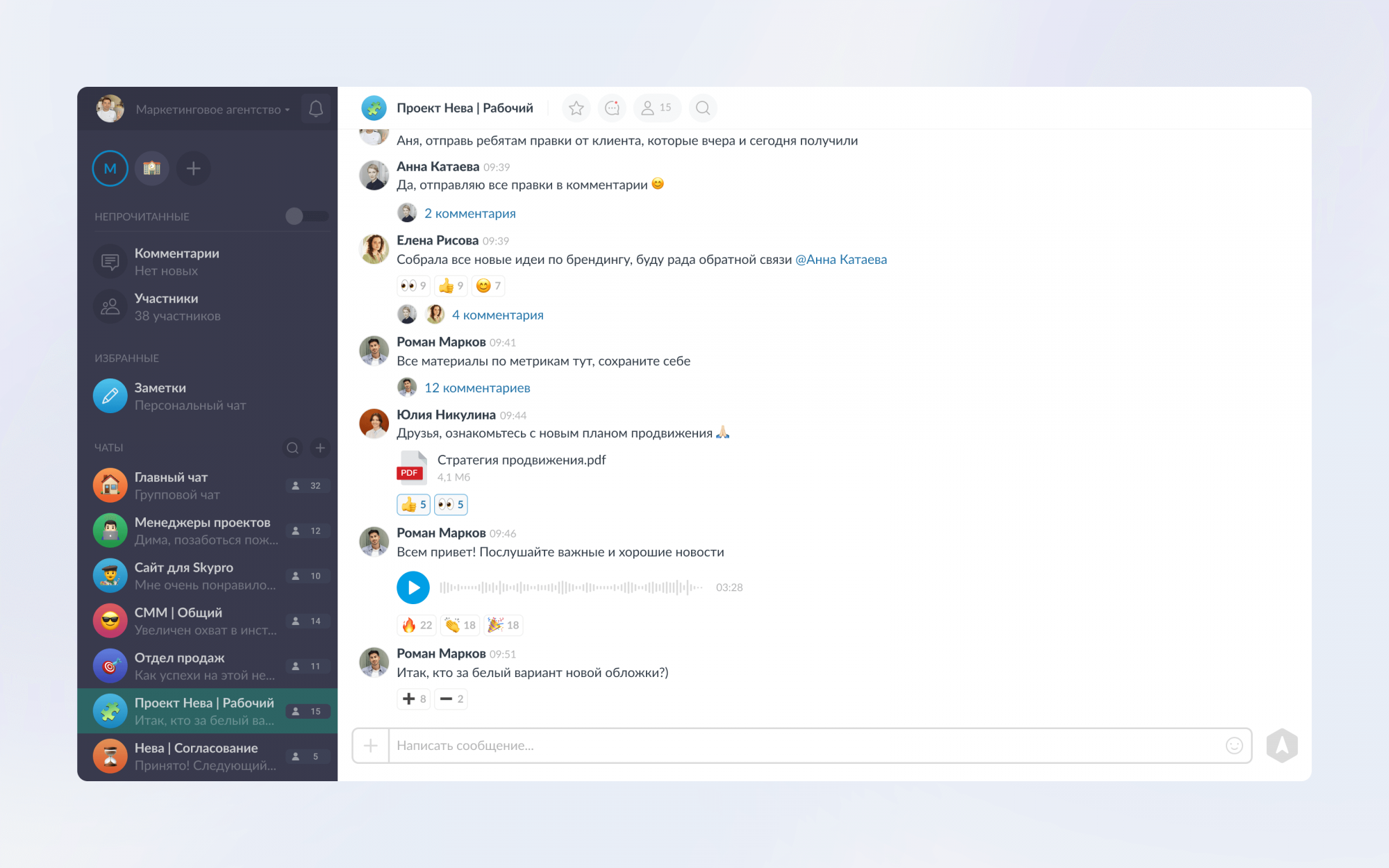 встроенный чат в режиме реального времени, где могут общаться участники команды.