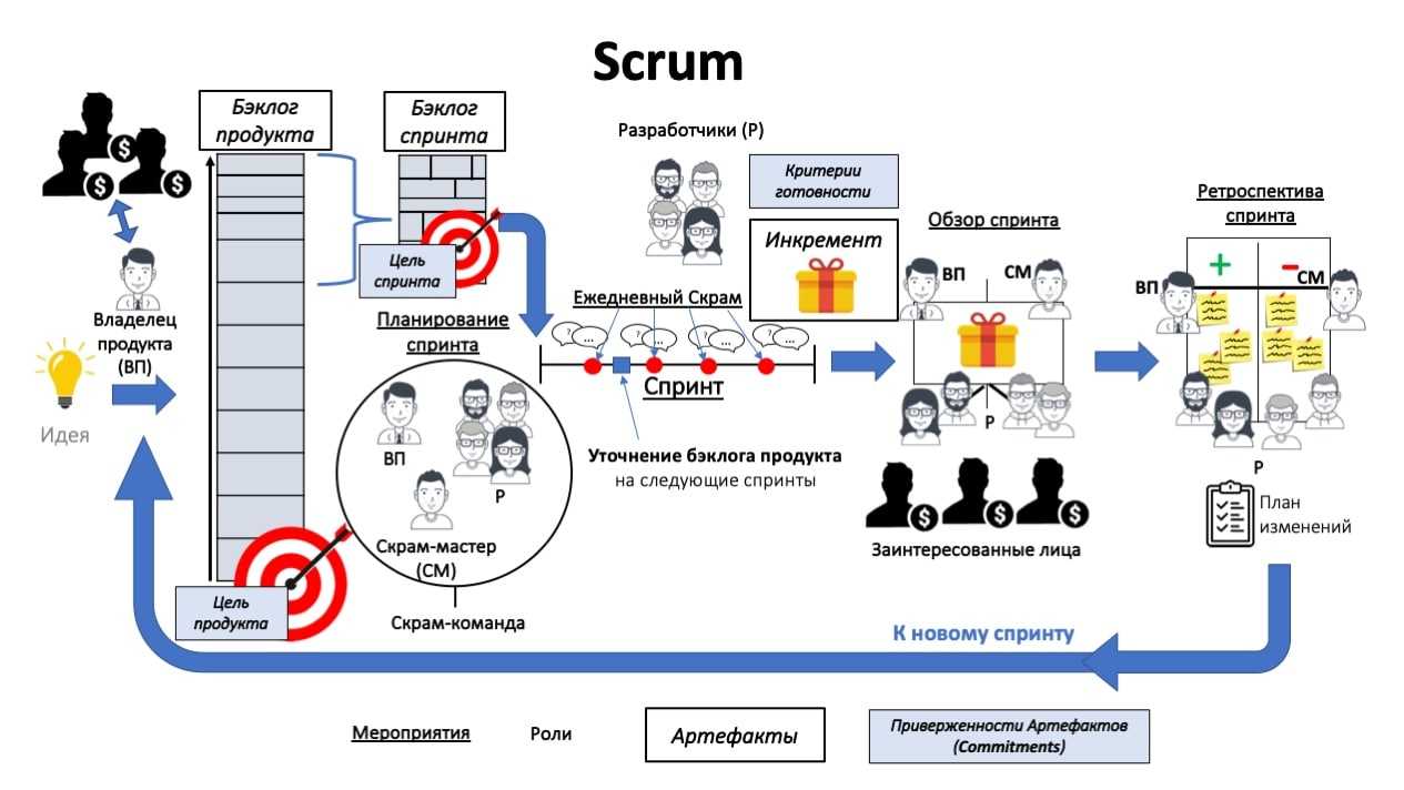 Основа работы по scrum — спринты длительностью от одной недели до месяца, в рамках которых команда обязуется взять приоритизированный набор задач из бэклога и создать инкремент (работоспособную часть ИТ-продукта, которая будет нести определенную ценность). По завершению спринта команда презентует результаты основным стейкхолдерам и владельцу продукта, после чего они все вместе принимают решение о дальнейших шагах.