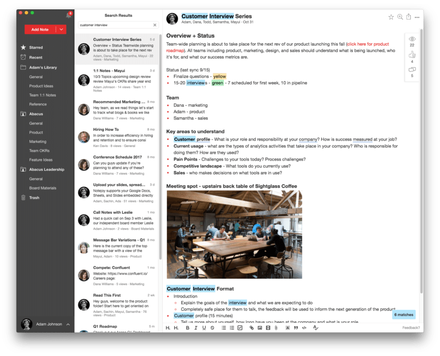 A note-taking solution needs to be fast and easy to locate your notes. Notejoy is an alternative for collaborative note-taking that offers a focus dashboard. You can add images, upload documents, create checklists and see it all in the same note. You can also create libraries around a topic and share with others, allowing collaboration in real-time. Team members can give reactions to notes, participate in discussions and @mention to bring others attention to the conversation.