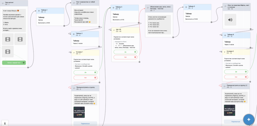 Один раз можно настроить бота, после чего установить его на все свои каналы. Функционал здесь богатый, удается автоматизировать несколько процессов. Рассылайте сообщения по группам пользователей с метками, принимайте платежи, заказы, организуйте техническую поддержку. Доступна интеграция с: