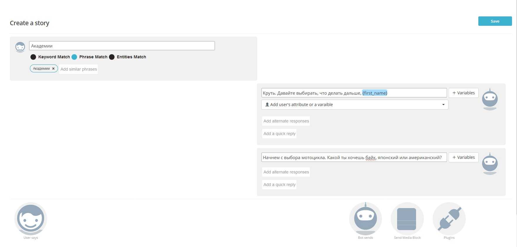 Так же англоязычный интерфейс. Есть бесплатный тариф. Возможность создавать чат-ботов в Фейсбук и с недавних пор добавили Телеграм, но нам не удалось его протестить, возможно бета-версия и пока не работает. Прост в управлении и лучший для стандартных задач.
