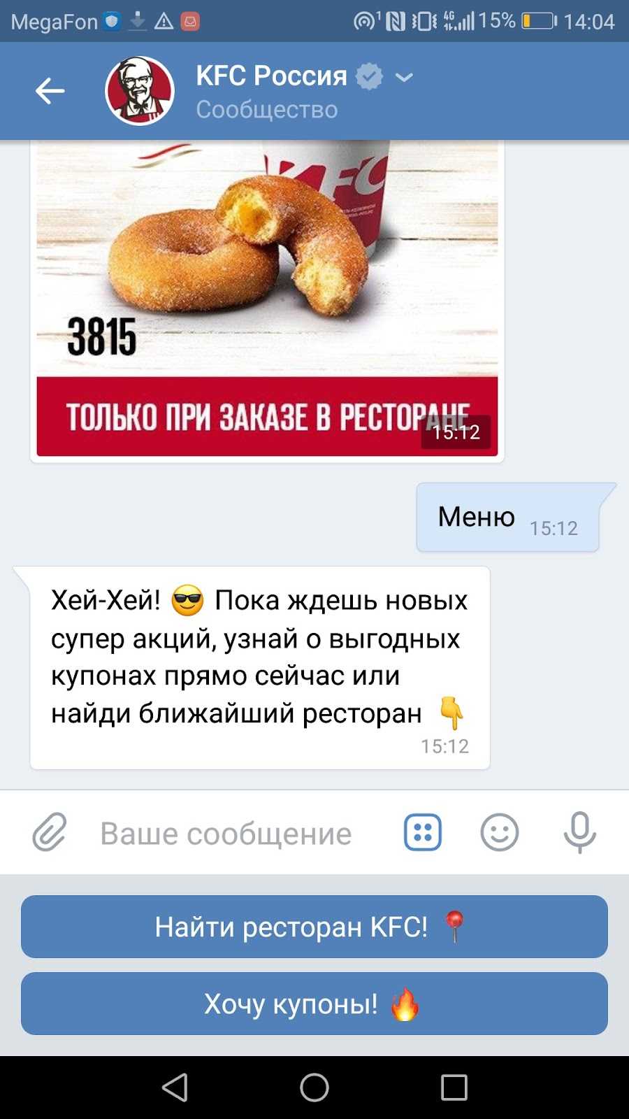 Бот функционирует в ВК. Найти его можно в официальном сообществе KFC Россия. Он помогает находить ближайшие рестораны, узнавать об акциях, а также найти подходящие купоны в меню. Простой, но удобный, ничего лишнего.