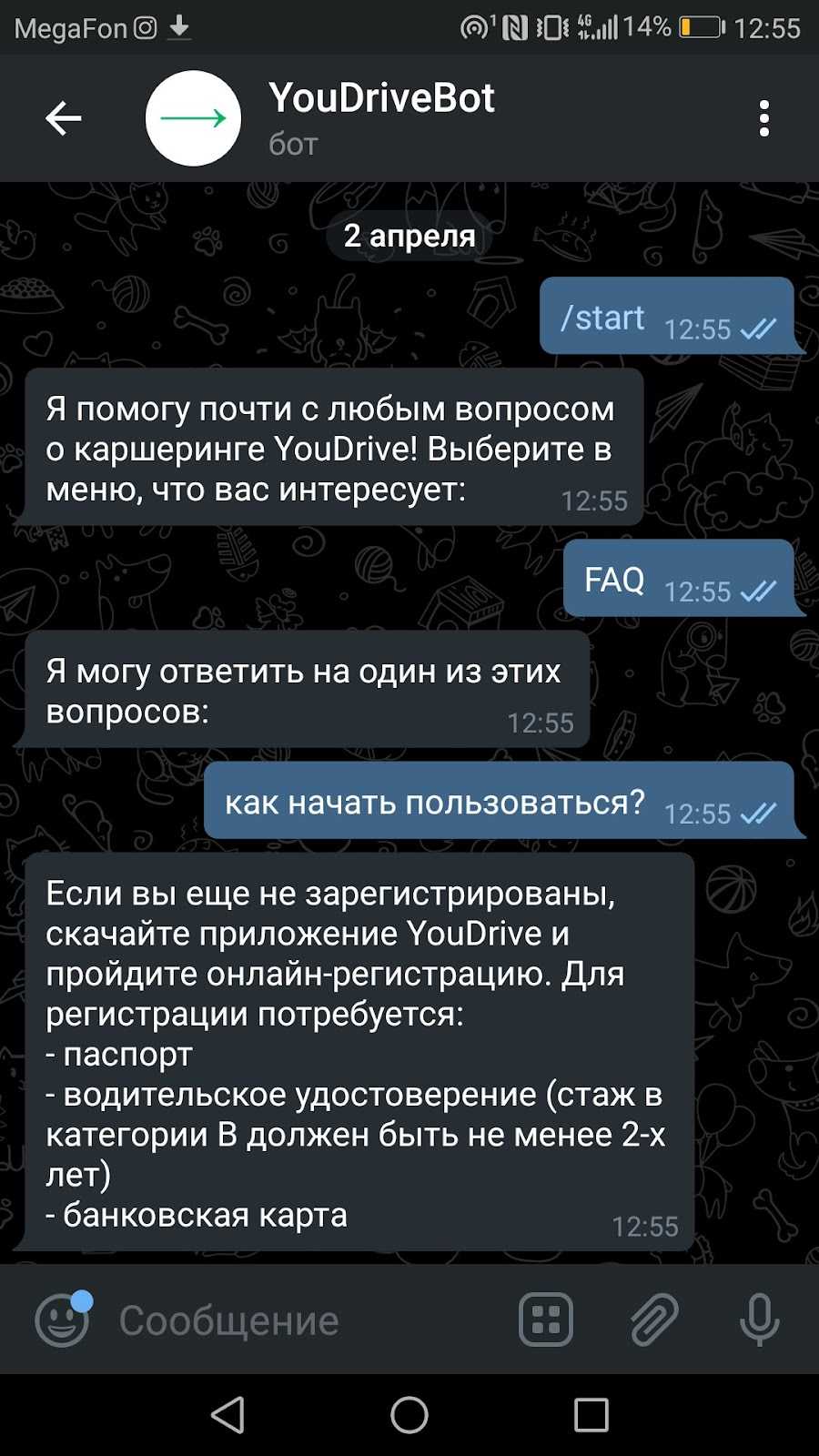 YouDrive — московский каршеринговый сервис запустил бота в мессенджере Telegram. Изначально YouDriveBot был только информационным: позволял получить ответы на часто задаваемые вопросы. Сейчас его функции расширились. Бот не только отвечает на вопросы, но и принимает отчеты о состоянии авто, а также помогает водителям в сложных ситуациях. Например: ДТП, угон, эвакуация, проблема с дверями. Также боту можно задать вопрос по штрафу.