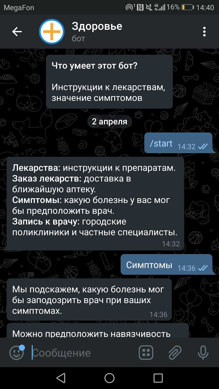 Команда запустила бота, который помогает получить инструкции к разным лекарствам, заказать доставку из ближайшей аптеки, по симптомам определить болезнь, записаться к врачу. Это не заменит консультацию с доктором, но поможет разобраться с небольшими проблемами.