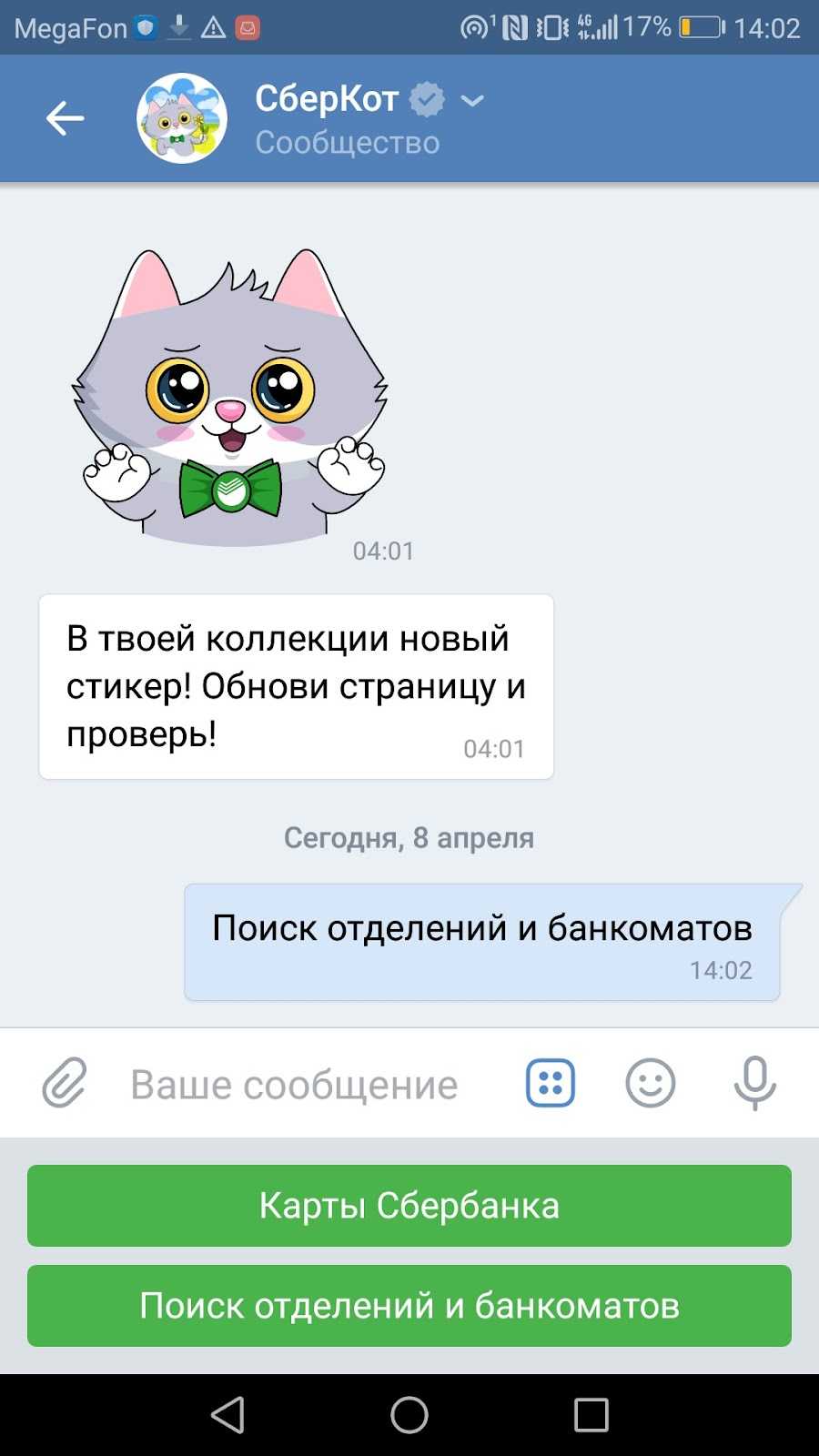СберКот — проект Сбербанка, созданный в соцсети Вконтакте. Кот помогает выбрать карту, дизайн и тариф, а также находит ближайшие банкоматы и отделения банка по геометке. А ещё СберКот регулярно присылает новости банка и интересные предложения своим собеседникам. Фишка этого бота в бесплатных стикерах, которые он частенько дарит пользователям.