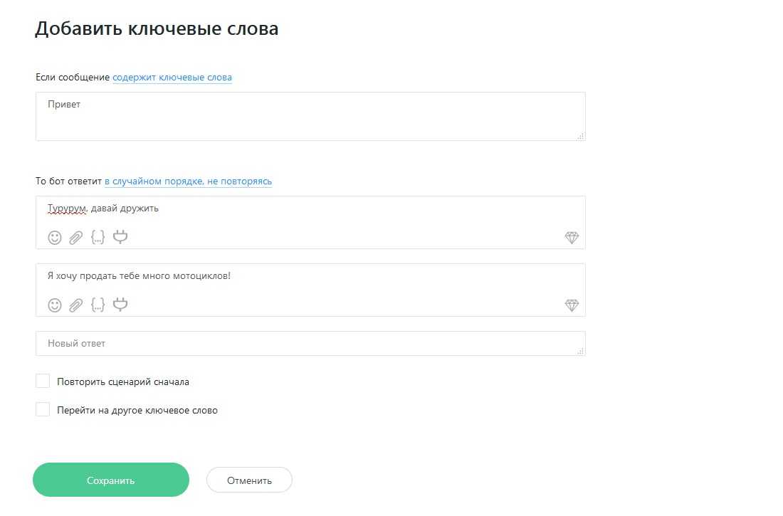 Robochat — бесплатный сервис для создания простого чат-бота. Настройка происходит через цепочки ключевых слов — бот отслеживает входящее сообщение и отправляет пользователю то, что вы настроили. Интерфейс сервиса простой, знаний программирования не нужно. Есть инструмент для массовых рассылок. Один бот может работать в ВК, Facebook, Telegram.