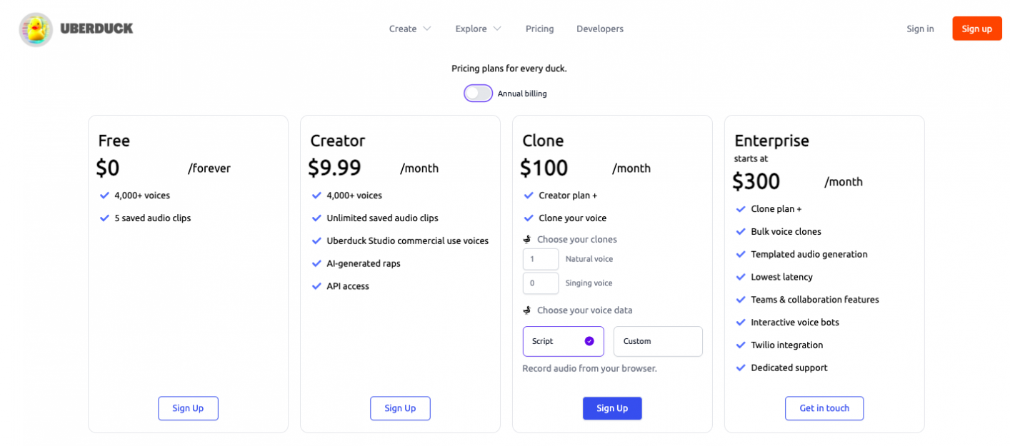 Бесплатно доступны более 4000+ вариантов озвучки, однако сохранить можно всего 5 аудиозаписей, при этом их коммерческое использование запрещено. Нужно больше? Тогда стоит оформить подписку — цены начинаются от $9,99 за месяц использования.