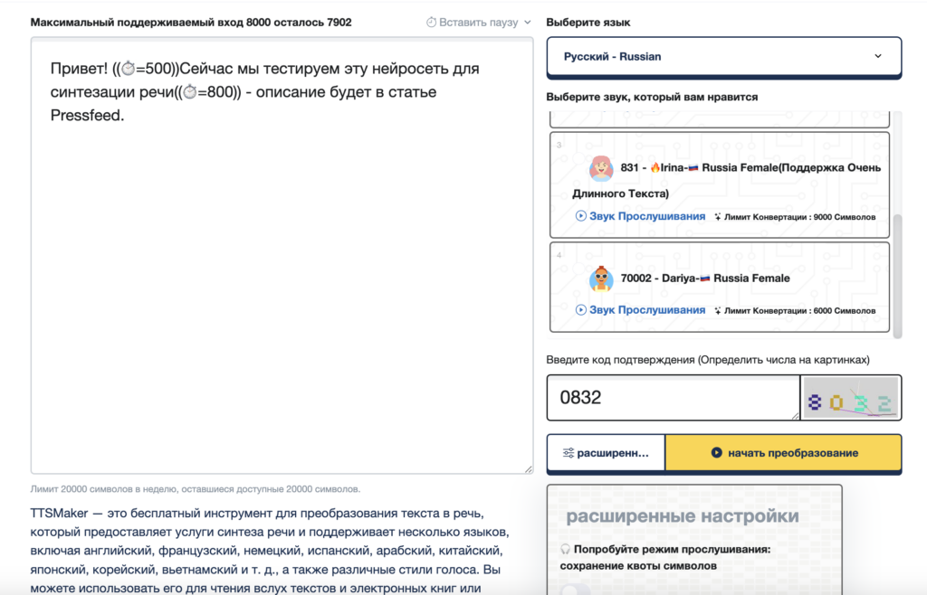 Удобный инструмент для озвучки, где вы можете расставлять паузы, регулировать скорость и громкость голоса. Доступны более 130 языков, также есть возможность добавления эмоциональной окраски голоса. Для теста у вас будет доступно 250 символов на конвертацию.