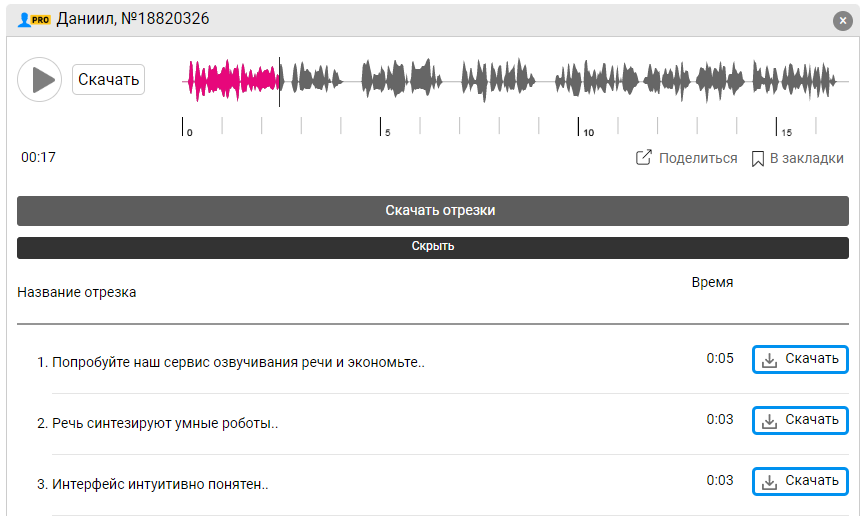 Озвучка отрезками. Представьте, что вы монтируете информационное видео, в котором тайминг аудио нужно будет подгонять под видеоряд. На Звукограме вы можете в одном проекте делать озвучку и в нужных местах поставить тег . Система при генерации голоса в этом месте обрежет файл. Так получится несколько отрезков, которые удобно будет использовать при монтаже. Их можно скачать, нажав одну кнопку или по одному. Вот так это выглядит: