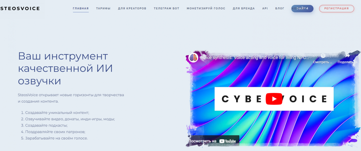 Удобный сервис на основе нейросети для озвучки на английском и русском языке. Искусственный интеллект включает 50+ голосов, среди которых вы найдете знаменитых актеров дубляжа. Также через телеграм-бот доступна бесплатная озвучка до 5 тысяч символов в день объемом синтезирования 250 символов.