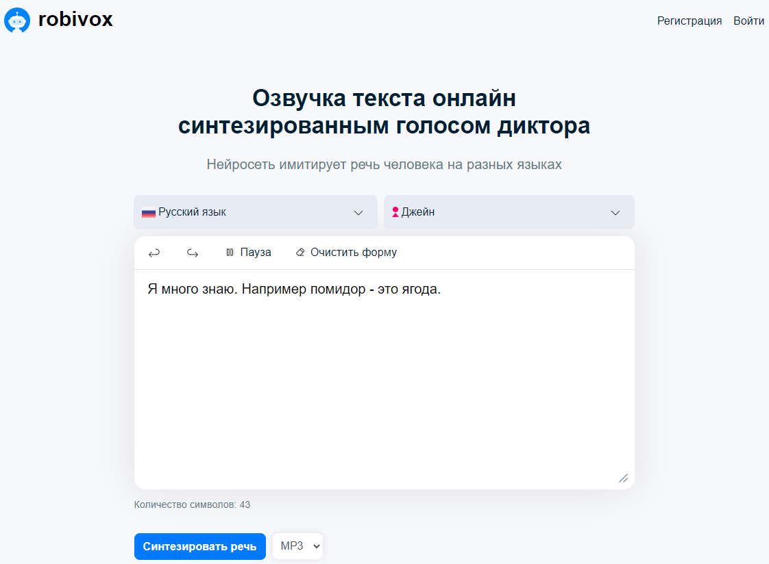 Представленный в поле текст можно заменить своим просто вставив его. Здесь же находятся инструменты редактирования, например, добавление дополнительного голоса для имитации диалога, добавление пауз и ударений, если робот по умолчанию не определяет их корректно.