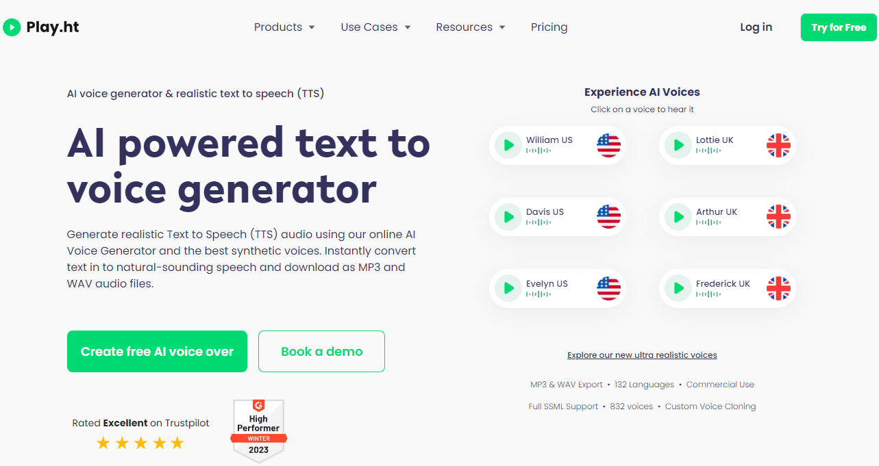 Сервис помогает генерировать текст в голос на 147 языках с акцентами, что будет особенно полезно для рекламы с локальным ГЕО. В нейросетке доступно более 900 голосов с возможностью выбирать скорость воспроизведения и расставлять паузы. Также есть очень приятная фича — возможность работы с API и интеграция сервиса с сайтом на WordPress.