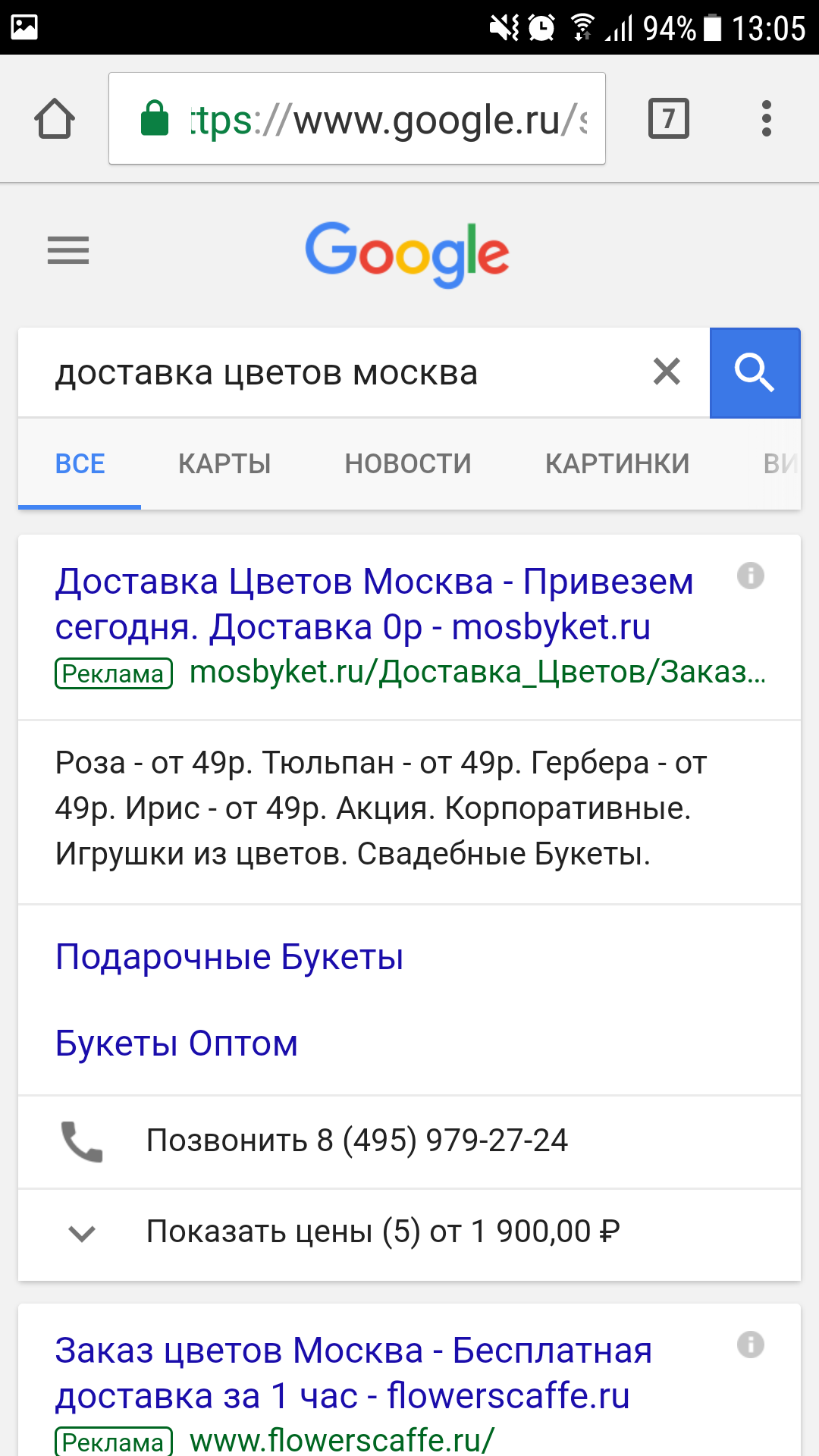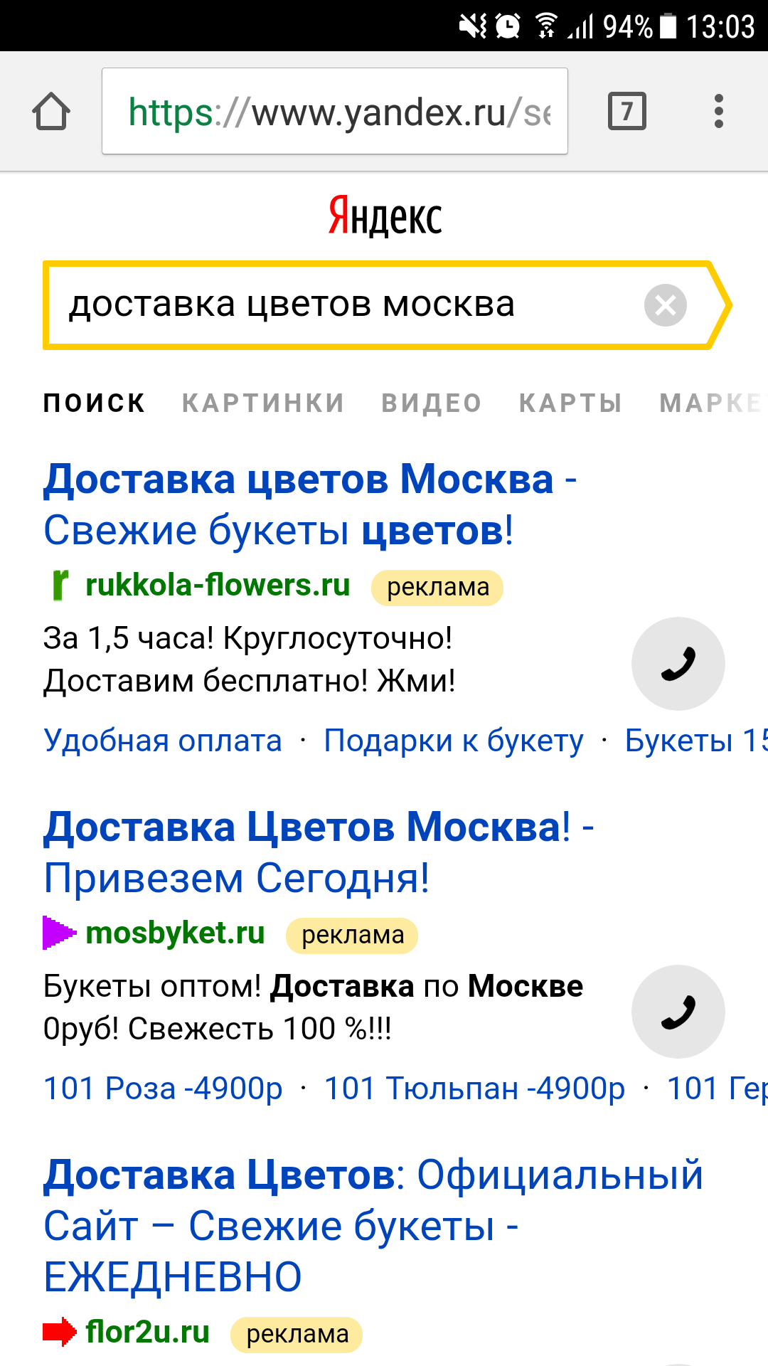 Основная общая рекомендация к мобильным объявлениям — готовить короткие, но ясные и понятные тексты. Экраны мобильных устройств меньше, чем у десктопов, а пользователь, который ищет с мобильного хочет быстро получить ответ на свой вопрос. Кроме этого, если через визитку специалист добавит номер телефона, то в объявлении покажется значок телефонной трубки, после клика на которую пользователь начнет набирать телефонный номер рекламодателя (это, к слову, касается и Google AdWords).