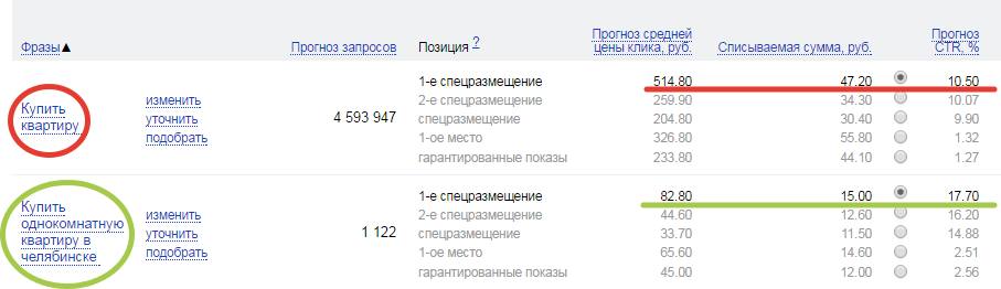 Запрос «Купить квартиру» будет самый дорогой и при плохой минусации может принести много нецелевого трафика, поэтому при первом запуске брать его для поисковой рекламы не стоит.