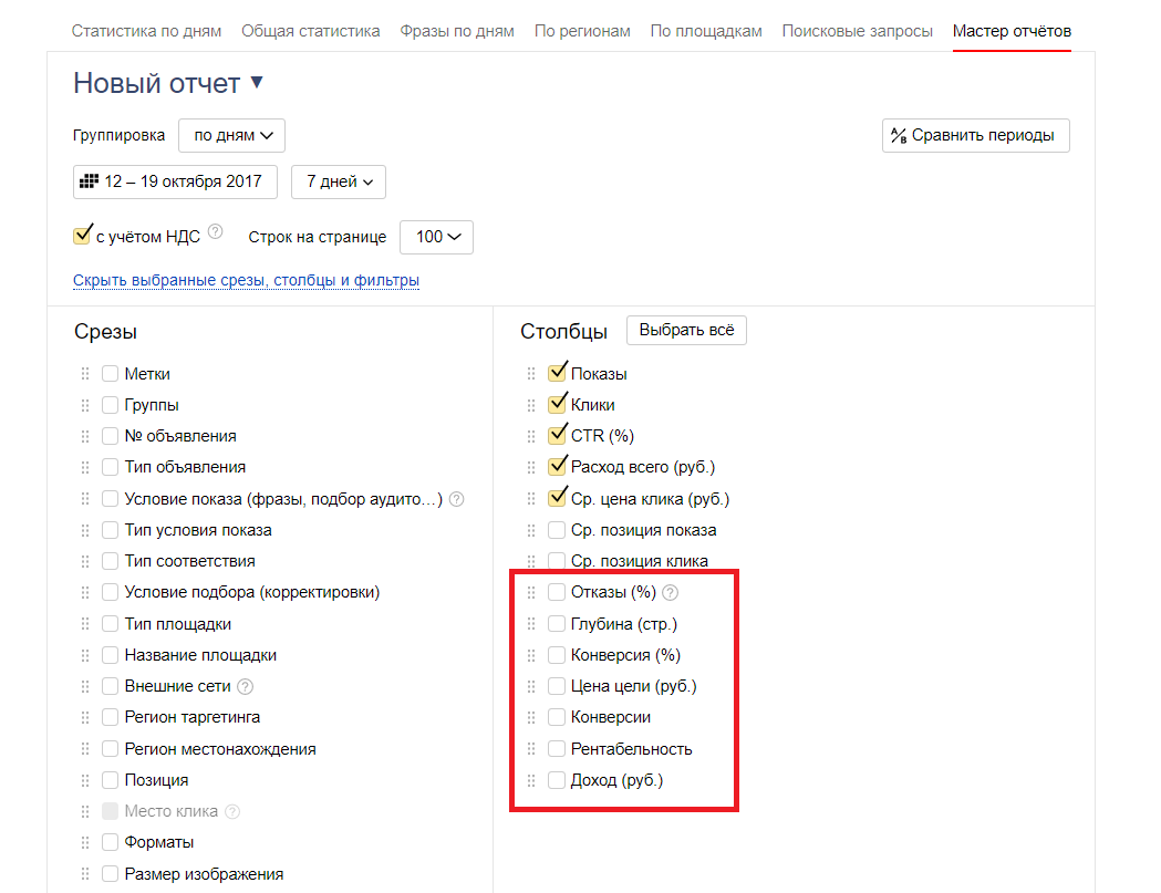 При корректной синхронизации Метрики и Директа специалист может импортировать в рекламную систему дополнительные показатели трафика: поведенческие (глубина, отказы) и конверсионные (конверсия, цена цели, конверсии, рентабельность и доход).