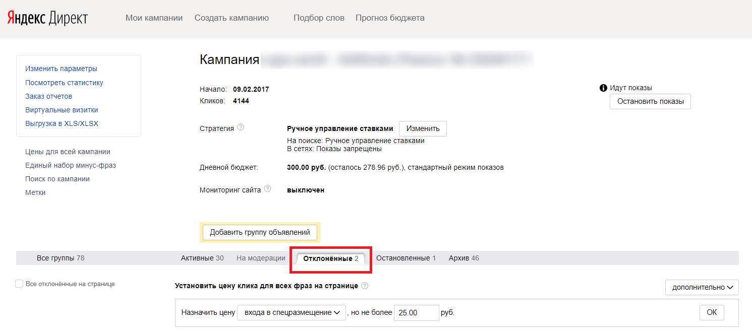 Удивительно, но после создания и запуска кампании специалисты не всегда следят за статусом объявлений. А ведь отключенные объявления — это потерянный трафик и конверсии. Увидеть, какие объявления не прошли модерацию можно на странице кампании в Директе.