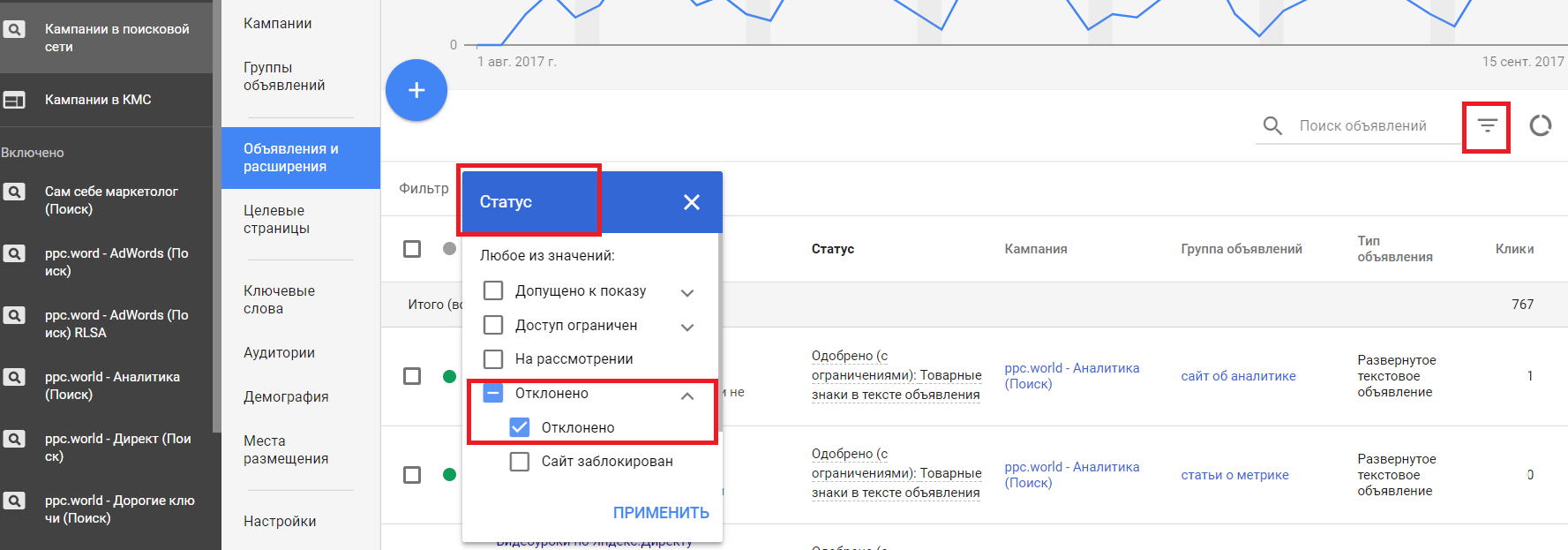 Чтобы узнать, какие объявления Google AdWords были отклонены, нужно перейти на уровень объявления и настроить фильтр по статусу «Отклонено»: