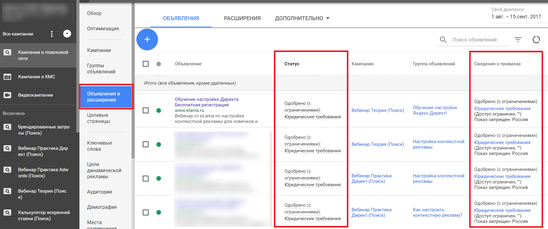 Одобренные, но не работающие объявления можно также найти по статусу, используя колонки «Статус» или «Сведения о правилах».