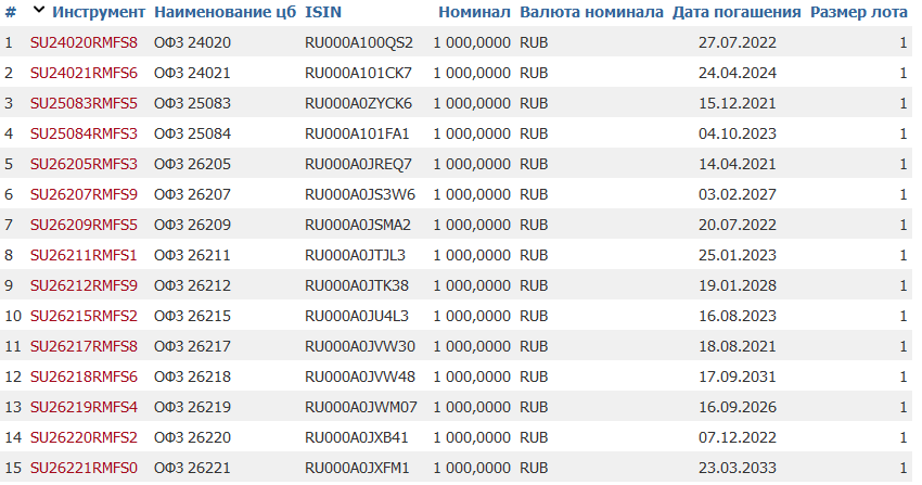 В отличие от акций, рублевые облигации более стандартизированы. Практически все они торгуются единичным лотом, а номинал в большинстве случаев равен 1 000 рублей. Это касается: