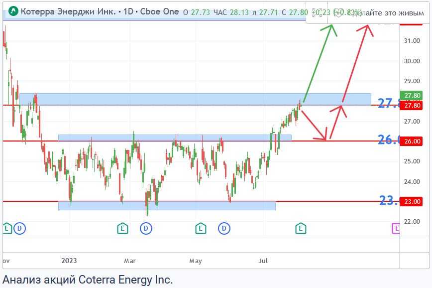 11 июля Coterra Energy Inc. котировки пробили сильное сопротивление на уровне 26 долларов и устремились вверх. На момент написания акции тестировали уровень 27,8 долларов США. Пробой этого уровня может спровоцировать дальнейший рост цены до 32 долларов США при историческом максимуме 36,5 долларов США.